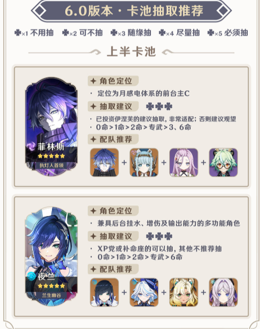 角色UP池90抽必出五星,小保底50%非当期UP,大保底90抽必出当期UP。6.0版本更新可获「命运之契」选常驻角色。命座溢出可兑换「星辉碎片」,集齐2个换当期UP命座。限定卡池保底调整为75抽,四星定轨机制40抽内必出目标角色。