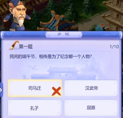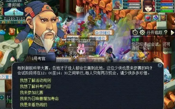 ③、考试流程:在建邺城衙门前找任意一位1号考官(144,81)或(69,104)和(171,27)答题,考试题目采用选择题的方式,每一关答对后即可找下一关的考官答题,同一关答错两次后也将进入下一关,但累计答错10次即被淘汰。