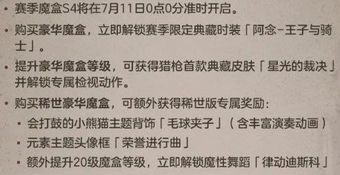 S4赛季魔盒 :7月11日开启,包含限定时装「 王子与骑士 」及典藏皮肤「 星光的裁决 」,升级可获专属奖励(如背饰、头像框)。