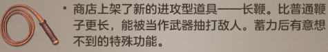 长鞭:新增进攻型武器,攻击距离远但速度较慢,蓄力可提升攻击距离并改变攻击方式(如拉回敌人或道具)。