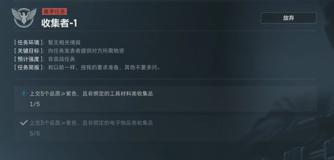 上交5个品质大于等于紫色的非绑定医疗道具类收藏品