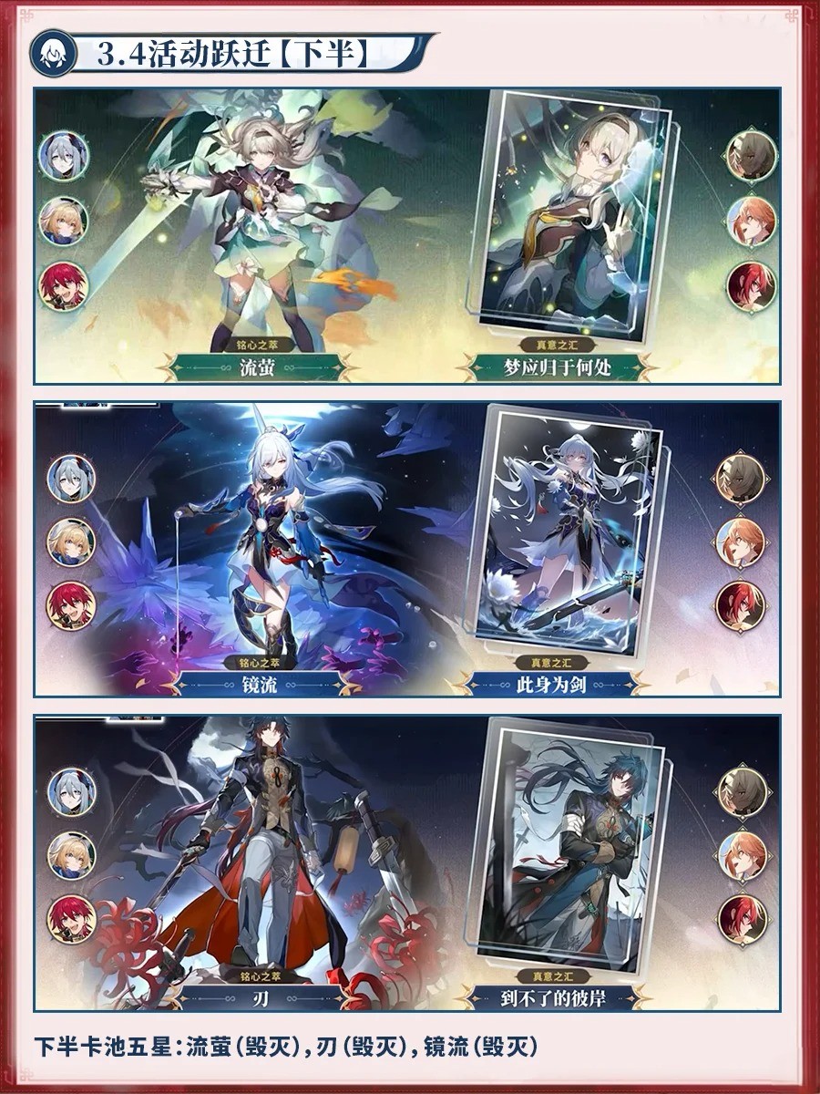 五星角色:流萤(毁灭)、刃(毁灭)、镜流(毁灭)。