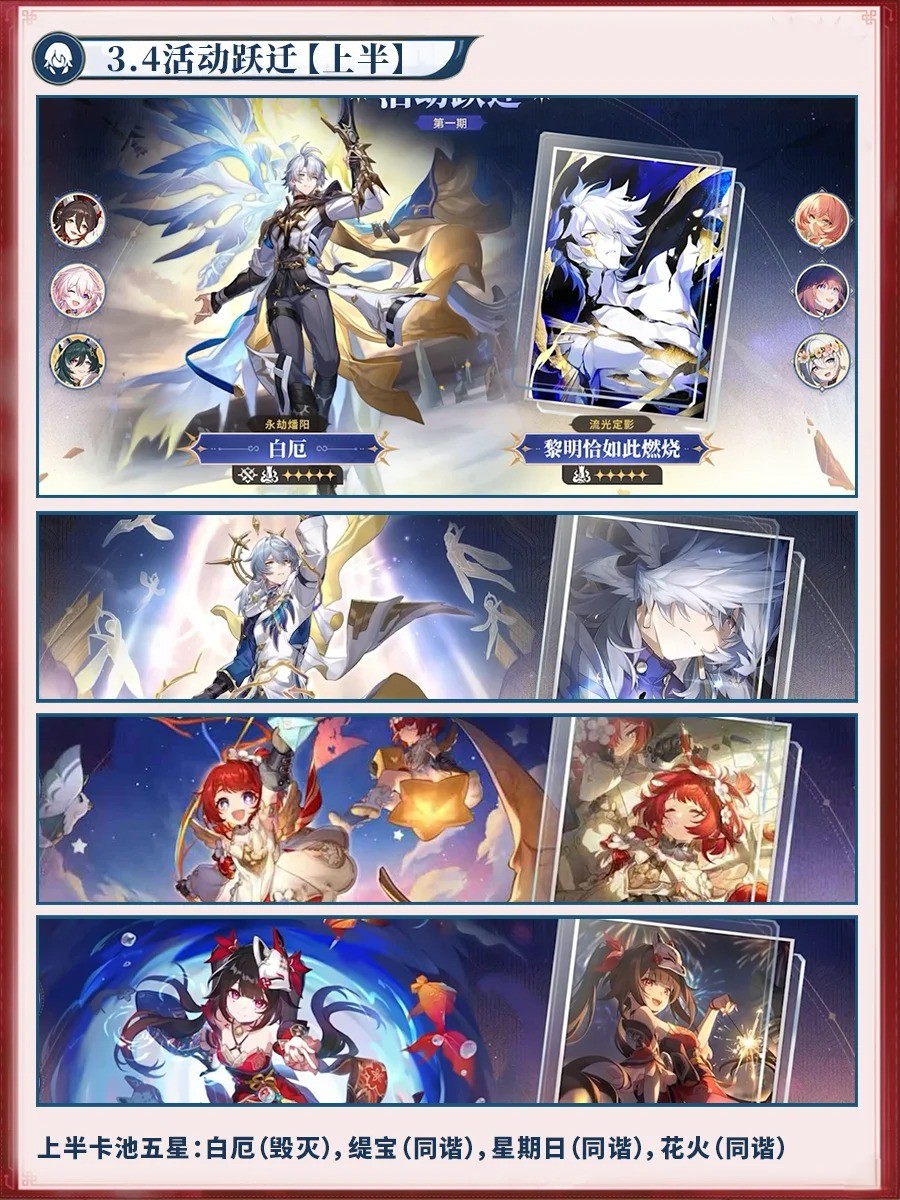 五星角色:白厄(毁灭)、缇宝(同谐)、星期日(同谐)、花火(同谐)。