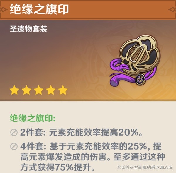 四件套效果:基于元素充能效率的25%,提高元素爆发的伤害。如果琳妮特作为主C,且元素充能存在问题,绝缘之旗印四件套可以很好地兼顾充能和伤害提升。