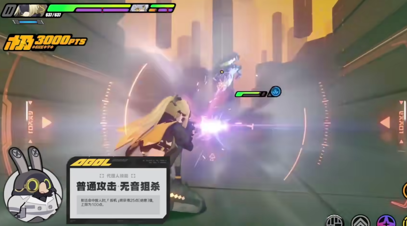 1.扳机定位为后台追击型击破手,核心机制围绕“双形态切换”与“协同攻击”展开。其远程狙击形态可精准打击敌人弱点,提供高暴击倍率;近战形态则通过快速劈砍叠加强化buff,为后台输出蓄力。独特的“绝意值”系统允许她在后台持续触发协同攻击,配合被动技能的20%失衡易伤(全队生效),使其成为雷系追击队的核心组件。