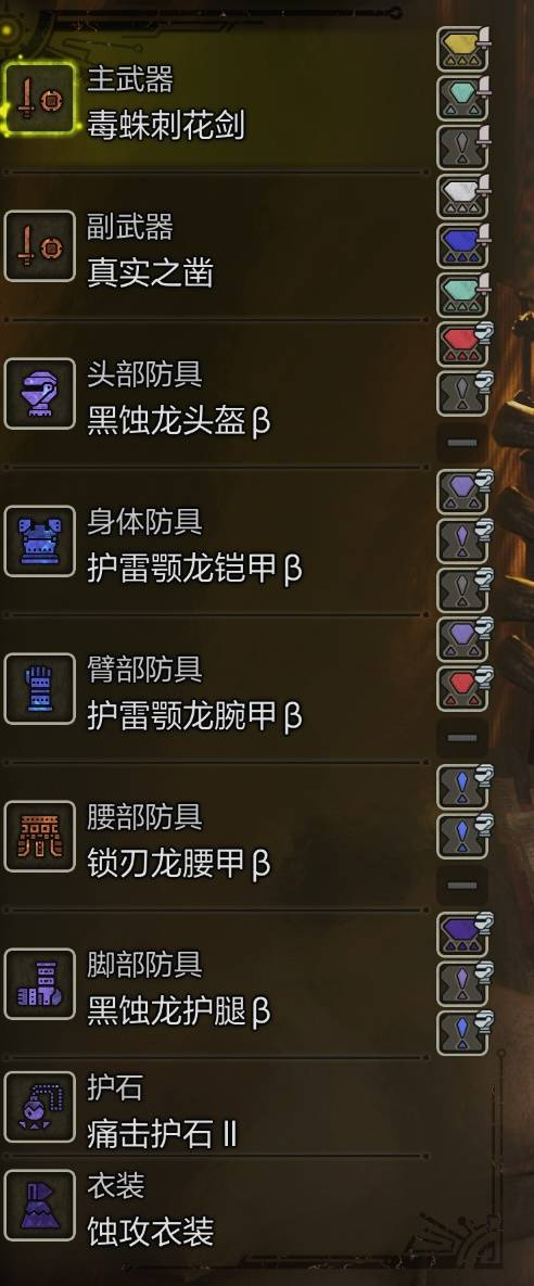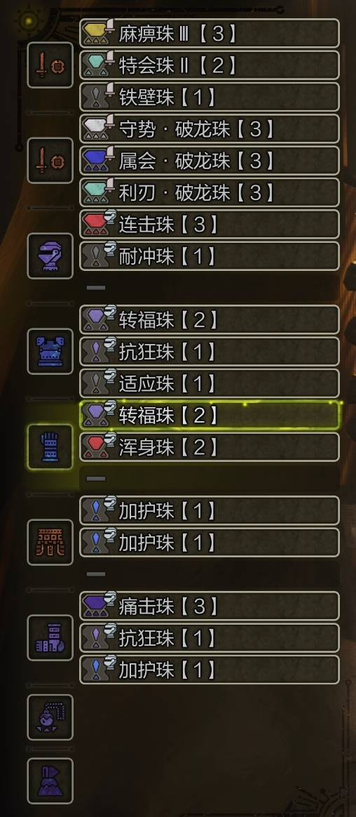 基本上带麻影响的技能都带齐了,还保证了生存,基本上野队打锁刃龙和黑丝龙6-8分钟一把可以麻4-5次,输出不低,野队基本上稳第一,跟朋友打5分内就3-4麻,也没有太低,一起打过得都说爽。