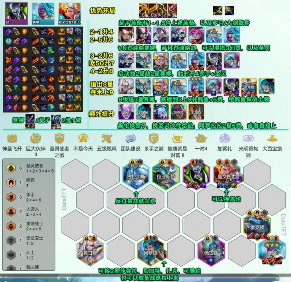 这套阵容由于美测多个更新加强了劫,让劫从下水道晋升T0成为主流的4F物理刺客运营体系阵容,优点就是成型非常强,通过调整站位可以精准秒杀对手的C位,缺点就是核心卡比较贵,容易抢不到牌。
