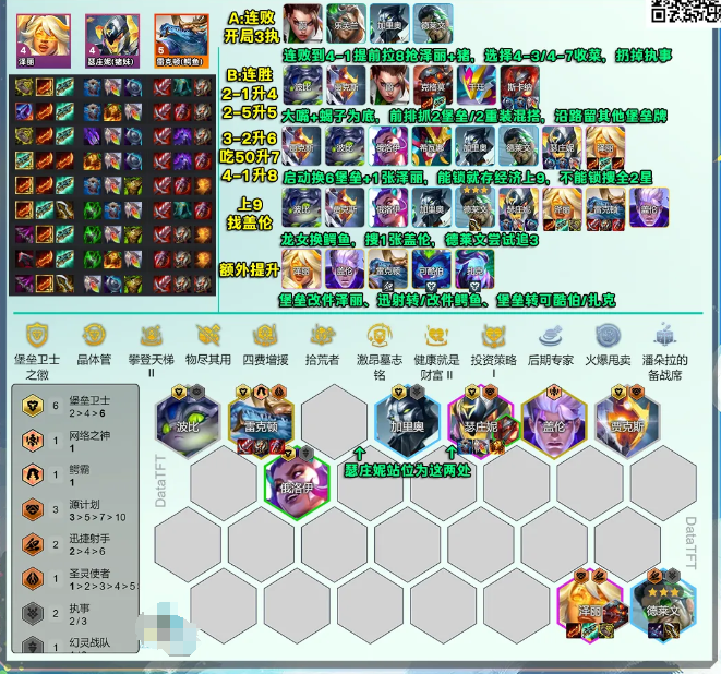 6堡垒+泽丽,和稻草人一样有壁垒转的时候不要给泽丽,因为这个版本有盖伦改件的原因,给你的主C找三件契合的输出装才是正解,然后就是1F的话只能丢波比,不能丢武器,武器+猪妹+泽丽的三源计划给的装备能很好的帮你补足装备的优势。