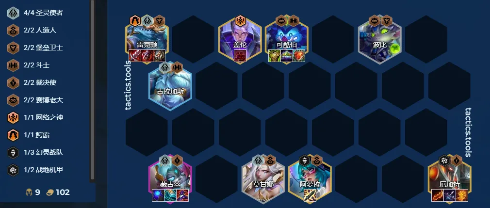 莫甘娜、酒桶、薇古丝、鳄鱼、盖伦、兔子、螃蟹、可酷伯、扎克,其中鳄鱼、盖伦、兔子是必上的5F其余5F如果没2就先上圣灵羁绊的棋子。