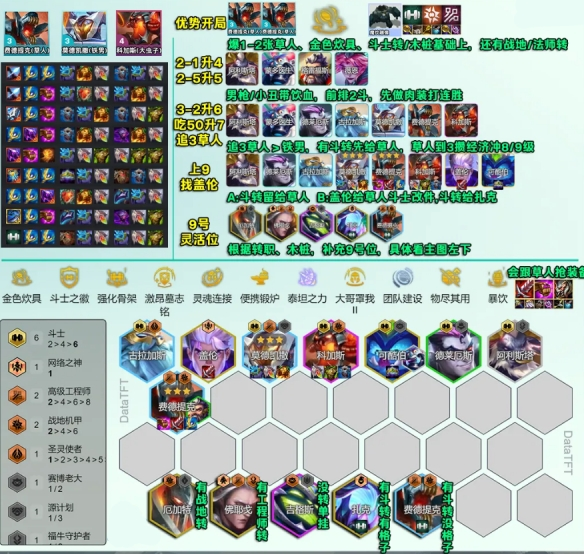 6斗+稻草人,有斗士转的前提下优先丢掉蒙多,5费努努来的时候再换掉牛头,如果没有斗士转那么就带牛头不带蒙多,毕竟牛头带控制,特别注意的是稻草人带斗士转只可以在缺少装备的前提下过度使用,在后面找到盖伦后开出斗士改件给稻草人即可,稻草人的三神装是一定大于斗士转的。