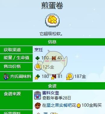 在星露谷物语中,烹饪系统是游戏中最重要的一个玩法,玩家们可以制作各种美味的食物,既可以用来卖钱,也可以自己留下进行使用,保证自己冒险中的各种需求,而且不同的食物也会有一些不同的效果。其中煎蛋卷这个菜就是很多玩家想要学会做的,不但原料简单易获得,而且效果也不错。那么星露谷物语煎蛋卷食谱怎么获取呢?一起来看看详细的获取方法吧!