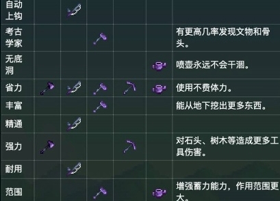 强力:镐子等级+1,斧头等级+2,提升矿石与树木的破坏效率。