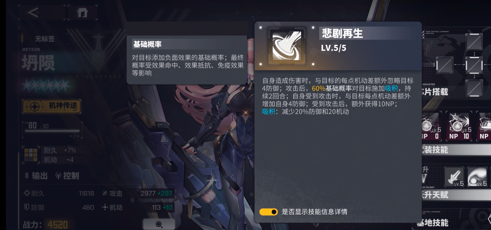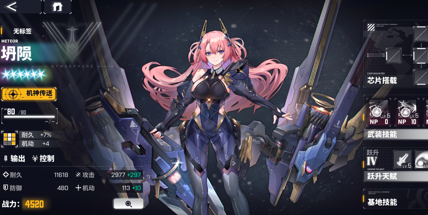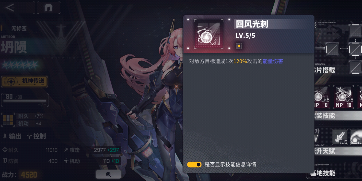 效果:自身造成伤害时,每点机动差额外忽略目标4点防御;攻击后,有20%的基础概率对目标施加“吸积”效果,持续2回合;自身受到攻击时,每点机动差额外增加自身4点防御;受到攻击后,额外获得10NP。