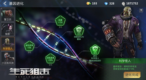 霸体技能可以算的上是铁甲盾的强化版本,可以进一步提升护盾的减伤效果。再搭配5阶进化带来的血量、减伤、能量回复等加成,足以让科学怪人成为变异战中变异体阵营不可或缺的肉坦系角色。如此给力的基因进化,喜欢“肉搏战”的童鞋,千万不要错过。