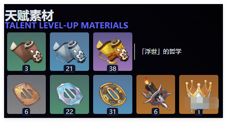 8级突破:需浮世的哲学x6、名刀镡x6、残火灯烛x1,以及260000摩拉。