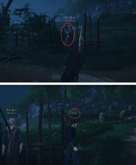 3.继续前行至岔路口,选择右侧上坡路线,找到倚靠栅栏的NPC「不二真人」。