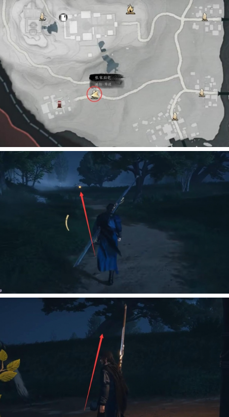 1.传送到「张家旧宅」后,转身朝灯笼方向移动,沿右侧大树路径前进。