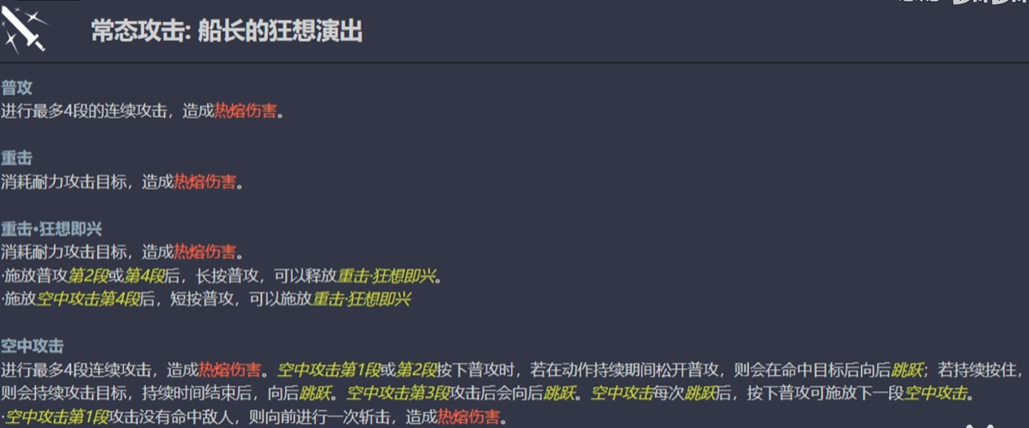 普攻:执行三段连续攻击,造成热熔伤害。重击:消耗耐力对目标进行强攻,造成热熔伤害。