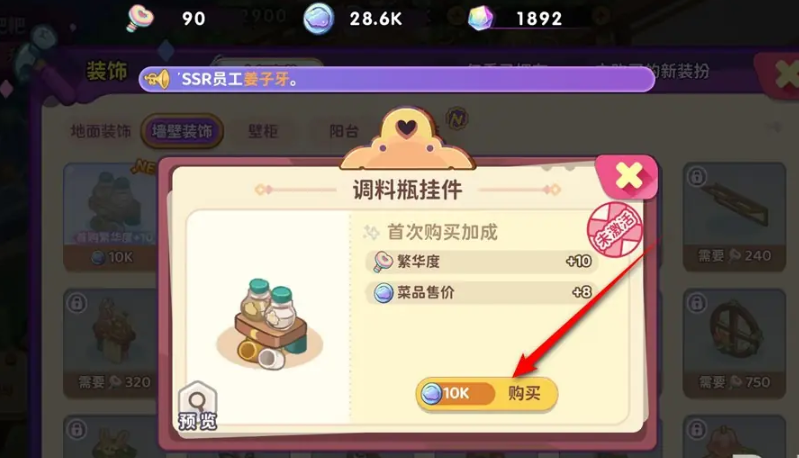 在装饰列表中滑动浏览,找到“调料瓶挂件”,点击购买按钮。需消耗一定数量的云币(游戏内货币)。