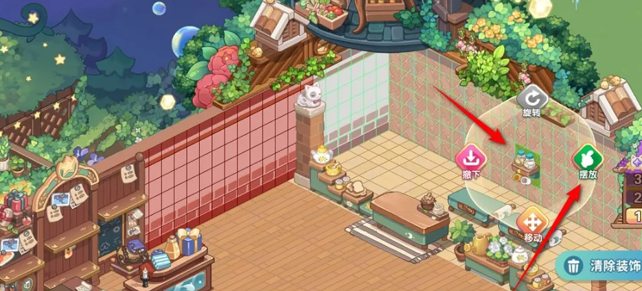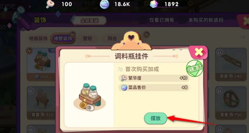 购买成功后,点击“摆放”按钮,调整挂件的位置和角度,确认后保存即可生效。挂件可为家园提升10点繁华度,并增加菜品8%的售价。