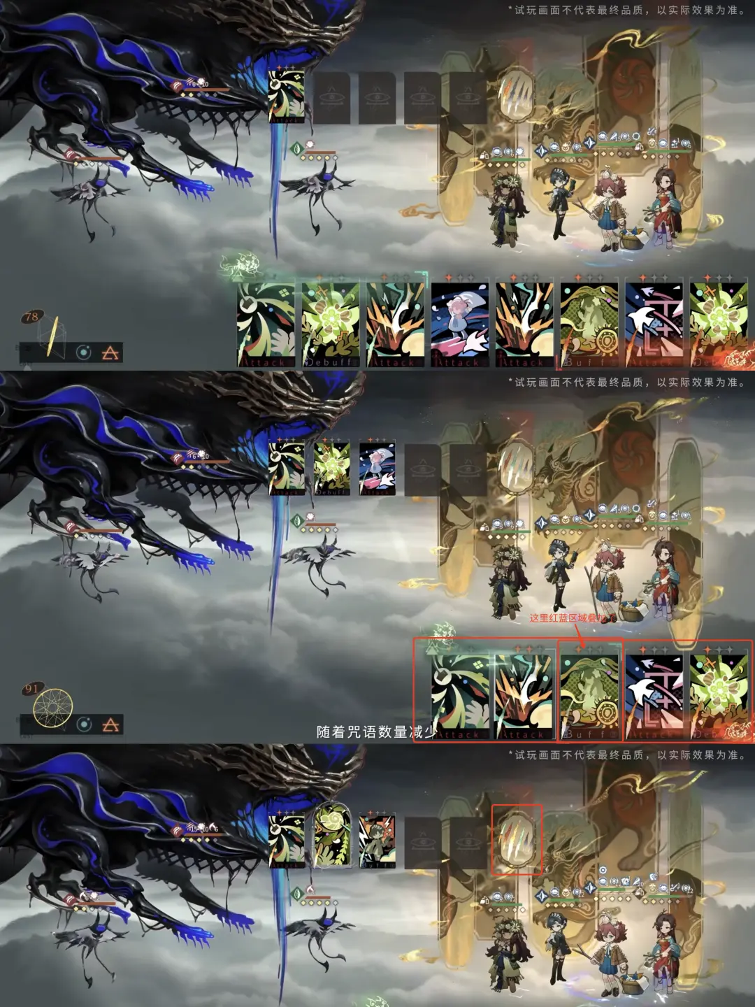 2.至终的仪式:召唤强梁,强化咒语区域效果。己方使用咒语时,根据区域获得阶次提升或状态时间延长。强化次数达标后,强梁攻击全体敌人,效果随区域比例变化: