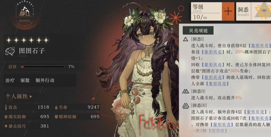 技能描述:群体攻击,造成一定比例的精神创伤;攻击后布设【象形贝壳】,并有一定概率提升图图石子的激情。回收【象形贝壳】时,己方全体回复回收层数×图图石子攻击×30%的生命值。