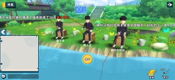 从我们的活动入口就可以进入我们的休闲玩法了,然后呢进入钓鱼界面,就可以看到自己和其他玩家坐在一条河岸旁边,搬着小板凳在钓鱼,左下角也是有即时聊天功能,还会有弹幕介绍自己与其他玩家的钓鱼情况,可以说玩家间的交互性还是很强的,良好的社交系统才能让玩家们更乐意玩下去。