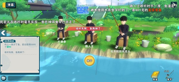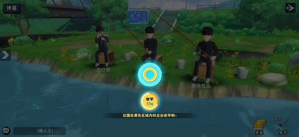 我们通过点击屏幕上的钓鱼,即可进入钓鱼环节,如果你认为这是简单的挂机那就大错特错了。但我们的鱼饵被鱼咬到之后,会有一个收杆环节,收杆姿势不对或者一段时间没有收杆,就会导致钓鱼失败的哦,而且会在弹幕上提示,这时候如果被别人看到的话,肯定会被哈哈大笑。