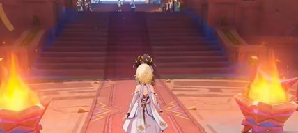 完成对话后,沿着眼前的红毯一直前进。在这个过程中,会触发更多的对话剧情,请继续跟随指引进行。