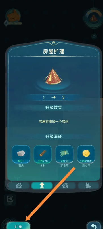 在扩建界面中,点击左下角的“扩建”按钮,并根据提示消耗相应材料。完成后,你的房屋将焕然一新,更加宽敞。