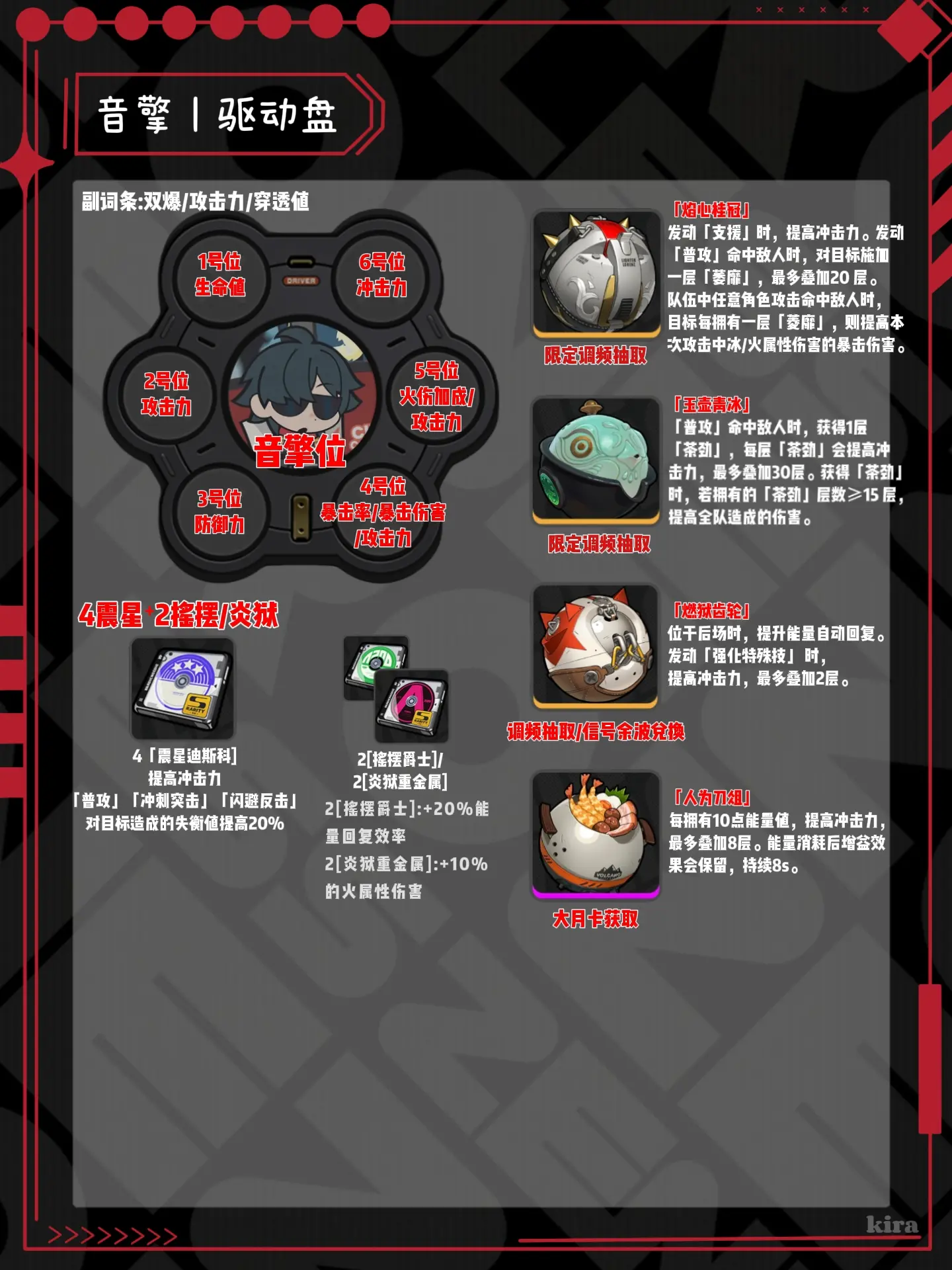 音擎与驱动盘选择:推荐使用“焰心桂冠”、“玉壶青冰”、“燃狱齿轮”作为音擎,驱动盘可选择“震星迪斯科”4件套和“摇摆爵士”2件套。