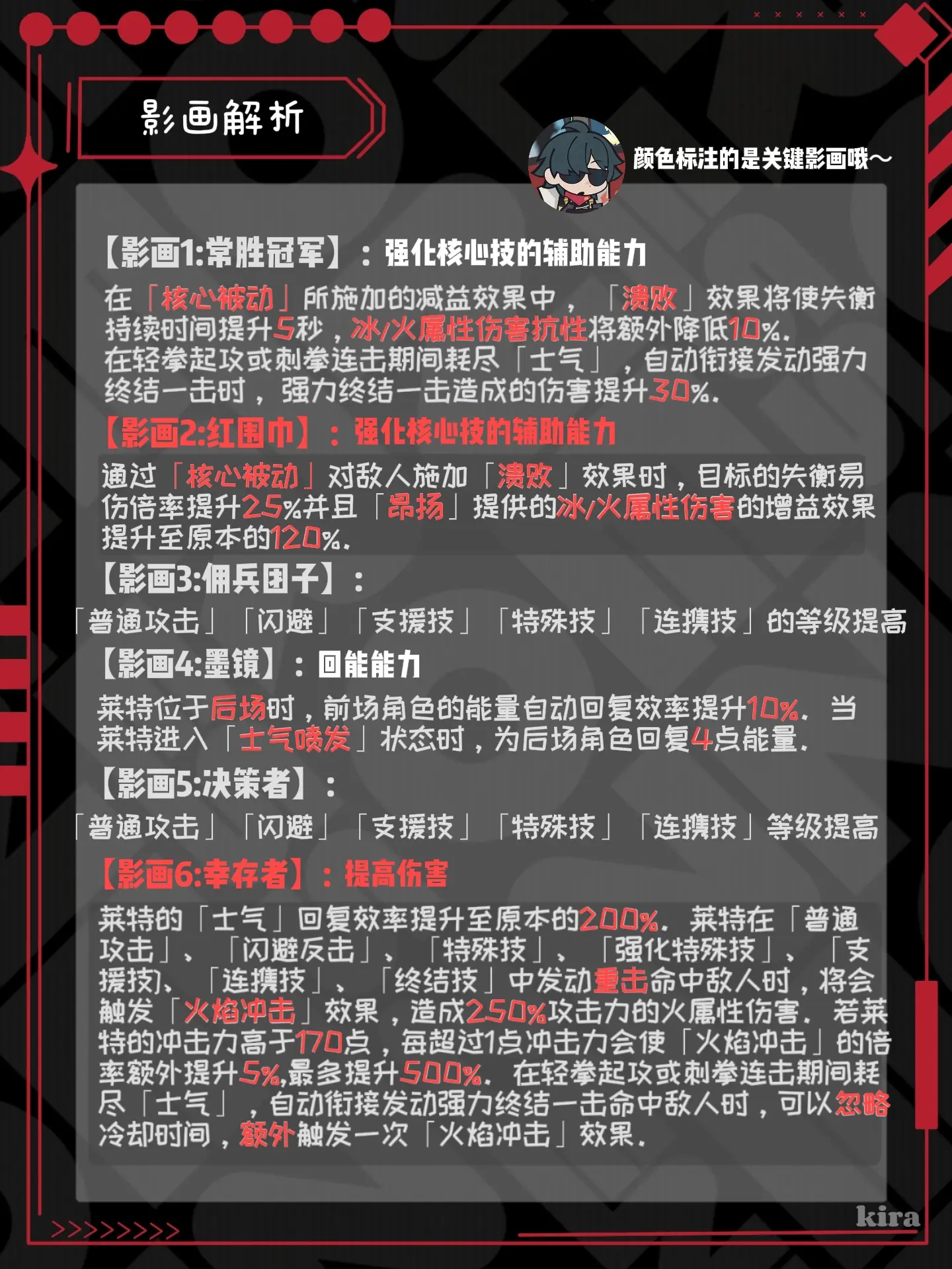 影画选择:关键影画包括影画2和影画6,分别强化核心技的辅助能力和提高伤害。
