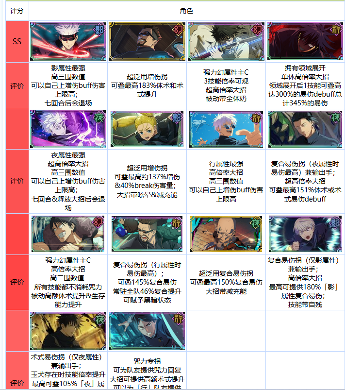 五条悟:影属性中的最强角色,拥有高三围数值和自我增伤能力,能在七回合内造成极高伤害。但需要注意的是,七回合后他会退场。