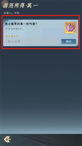 解答问题:打开神念禁制后,会显示相关的问题和奖励信息。在输入框中输入正确答案(例如“炼气”),然后点击提交。