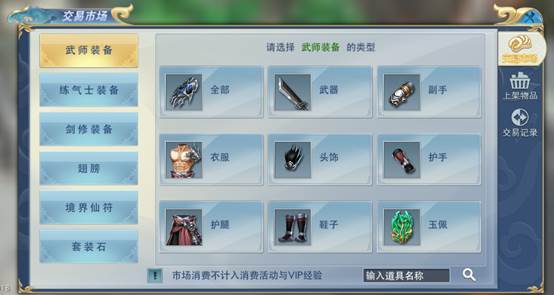 游戏的自由交易系统是真的完全自由交易,可交易的物品包括有装备、翅膀、翅膀材料(非常稀有)、境界仙符(稀有)、其他(杂物、套装石、精炼材料、精魄、转职材料、灵魂碎片)