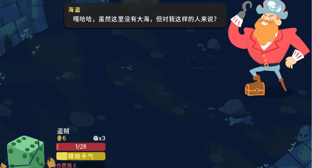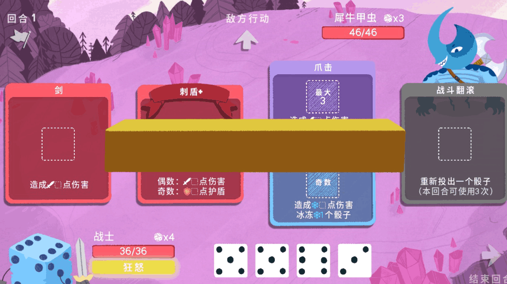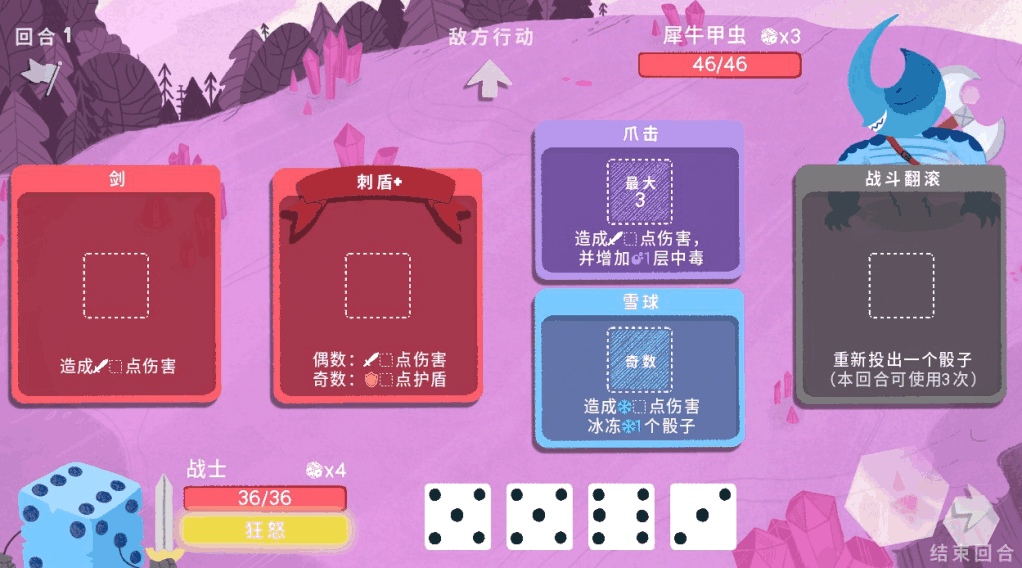 游戏的核心战斗玩法为回合制,玩家通过每回合获得的骰子激活相应的技能并对目标造成伤害或DEBUFF。由于角色的技能可以通过地图中打开宝箱和商店里购买获得,而技能可以在非战斗模式下进行装备或替换,因此我将游戏里的技能称之为卡牌。而战斗中使用这些卡牌则需要每回合获得的骰子才能使用,不同的技能所需要的骰子点数和骰子数不同,有的需要奇数或偶数,有的则需要一对,更有一些比较刁钻的需要指定骰子数。而游戏中的骰子角色便拥有完全不同的卡牌和获得骰子的模式,比如战士可以每回合获得与等级相等的骰子,机器人可以通过随机抽奖且总点数不能超过CPU计算上限的方式获得骰子,魔法师可以让骰子直接变成1点伤害的战斗卡牌。