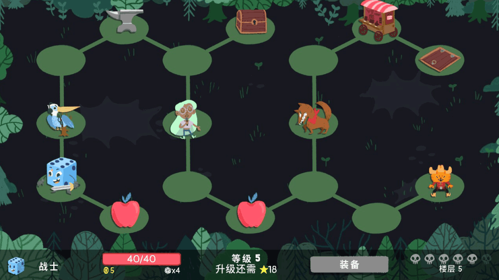 游戏一共六个关卡,玩家可以选择消灭每个地图上的所有怪物或是消灭通往下一关入口路上的怪物。除了怪物外地图的格子上还会有商店,锻造,宝箱和HP恢复。根据我的体验,在较高等级的升级阶段非常依赖地图上的资源来维系,因此非常重要。