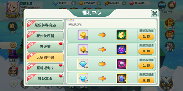 在主城页面的上方有一排的神秘功能,其中有一个叫【福利中心】,点开福利中心,找到我们今天的主角:天空的补给,在其中只要满足条件即可轻松兑换经验道具,点击即可升级,简直不要太快了!