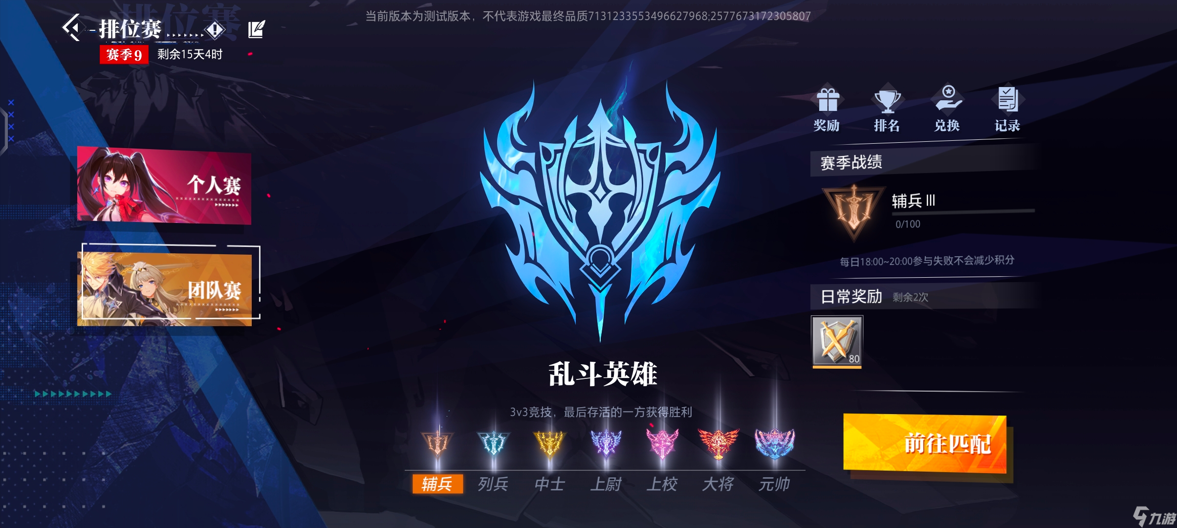 而团队赛同样也有七个段位分别为辅兵、列兵、中士、上尉、上校、大将、元帅。团赛由双方各3名玩家同时参加,进行对战,对战结束可以获得战点奖励,可用来在商城中兑换道具。赛季结算时也会根据玩家的段位及排名发放奖励其中包括狂猎之证、催化剂、高级校准罗盘等!