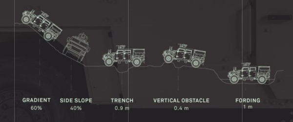 60度爬坡、40度侧向沿坡行驶,越沟0.9米、跨垂直障碍0.4米、涉水1米,很强的越野性能了