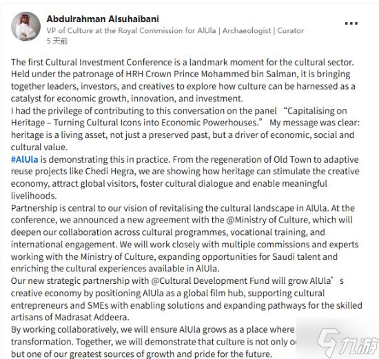 苏海巴尼上周在领英发文称,他刚在沙特首届文化投资大会上参与题为"文化遗产资本化——将文化符号转化为经济引擎"的专题讨论,该会议重点正是埃尔奥拉地区发展规划。