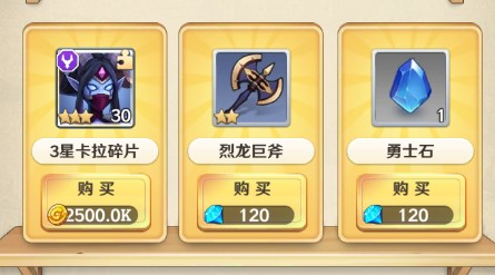 4. 商店中会刷新出能够用金币购买的英雄碎片。金币用处多多,除了用来升级英雄之外,在杂货铺中会刷新能够用金币购买的英雄碎片和其他道具。(记得好好存金币,不然刷新了想要的道具金币却没钱买就悲剧啦~TAT)