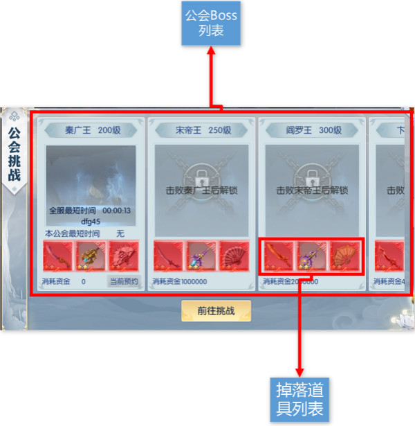 不同的公会boss需要消耗不同数量的公会资金,第一只公会boss无需消耗公会资金,预约阶段预约boss后不会立即扣除公会资金,系统会在预约阶段结束后才会扣除预约阶段预约boss消耗的公会资金,这里可能有人提出问题了,如果到扣除的那个时间,当前公会资金不足以支付预约阶段预约boss所消耗的公会资金该怎么办呢?铛铛铛,所以考虑到这种状况做出向前顺延的处理方式,也就是说如果扣除时发现当前公会资金不足,那么自动选择前一只boss,如果当前公会资金还是支付不了前一只boss的消耗,那么继续选择前前只,直到选到当前公会资金可以支付的boss,反正第一只boss是无需消耗公会资金的,所以各位公会会长不用担心了,总归会有boss可以打的。