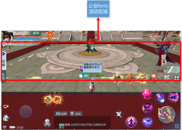 红框区域是boss活动区域,如果没有玩家进入boss可攻击范围,boss始终都会在这一区域内待机,公会小伙伴们进入公会也不用担心找不到boss,找到黄色光圈就能看到boss啦。