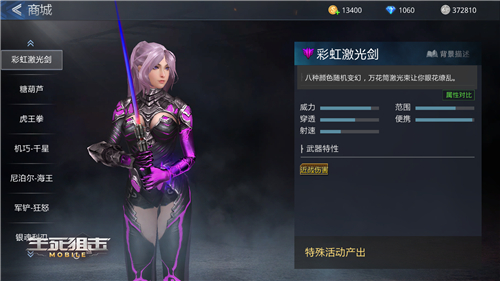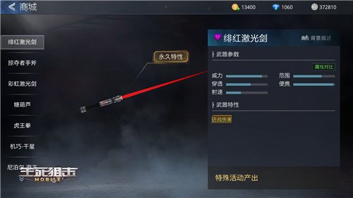 在《生死狙击》手游中,早在绯红激光剑登录之前就已经有类似的光剑武器存在了。首先就是在商城中目前仍然可以买到的激光剑武器,只需消耗3540钻石或者1180金币即可完成购买。不过与绯红激光剑相比,激光剑的光束颜色是淡蓝色,整体外观上低调不少,不如绯红那般引人注意。