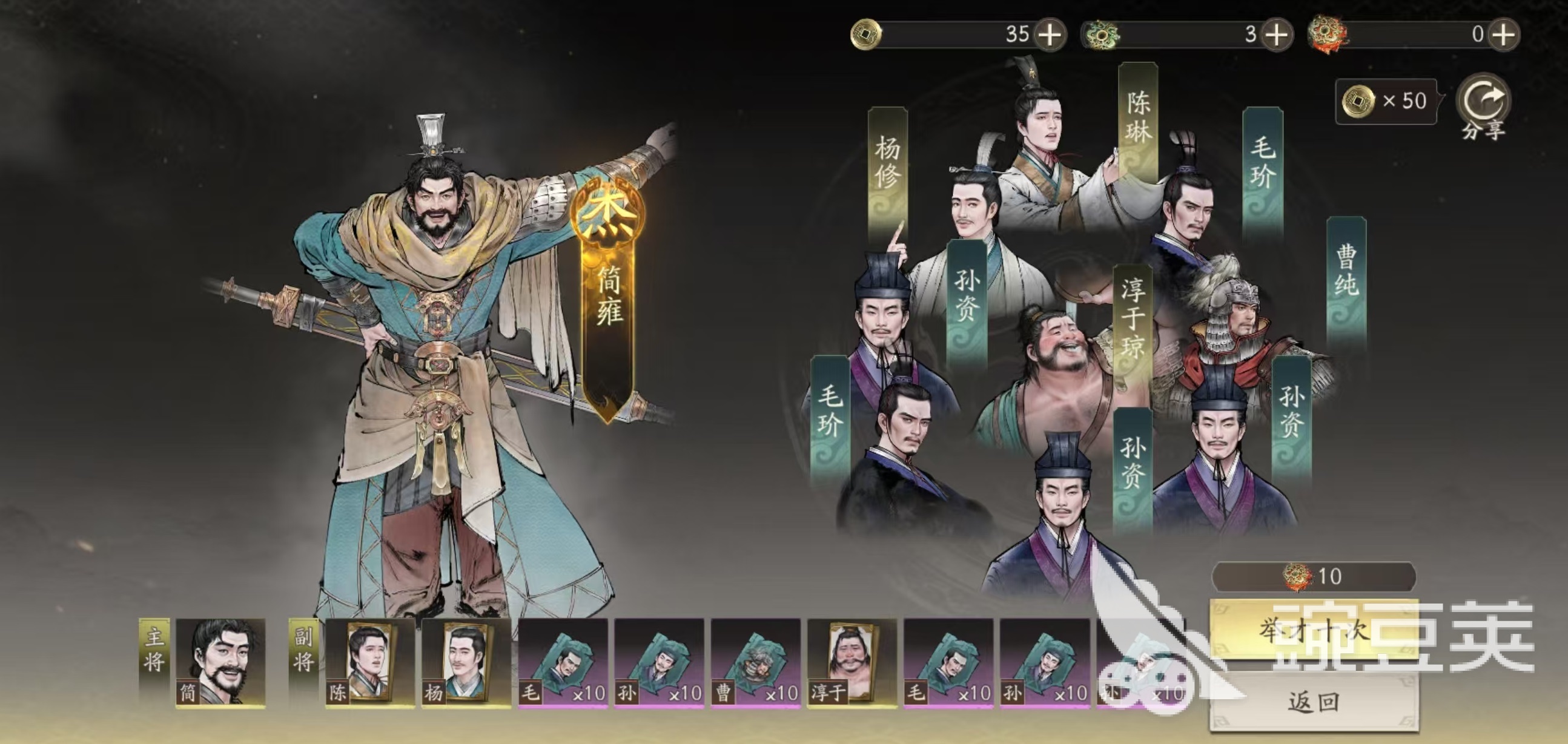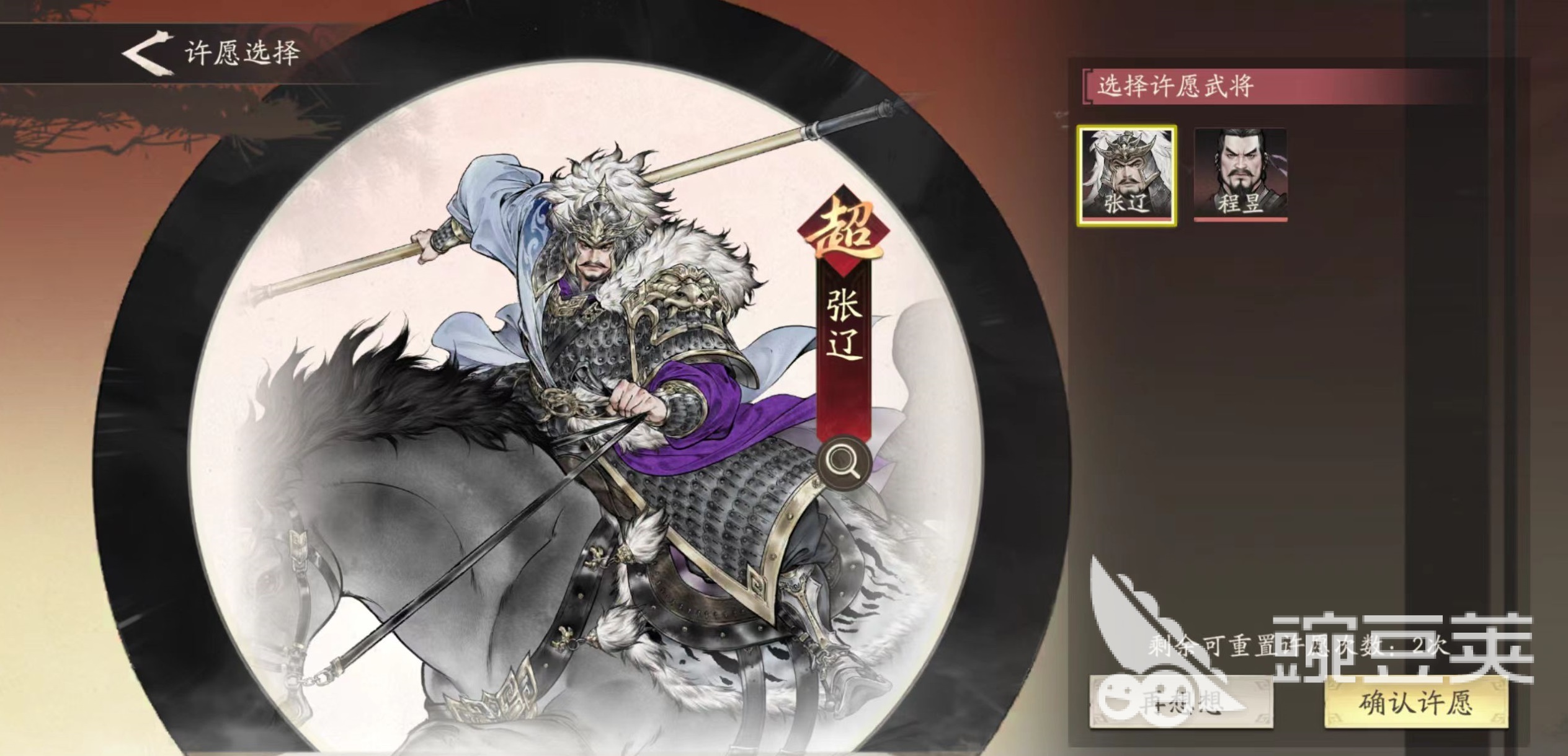 在完成新手卡池的抽取之后,接下来就来到了自选武将概率提升池。之所以叫自选概率提升池,是因为玩家可以根据自己的需求,有针对性的提升特定武将的抽取概率。当然在自选其中也并不是所有的武将都可以加入自选,也会根据当前的版本情况开放不同的武将。例如在之前测试中自选开放的就是程昱和张辽。这里小编就推荐大家优先去抽取张辽,是游戏中泛用性很高的一名骑兵武将,当然程昱作为肉盾型谋士也比较适合选择。