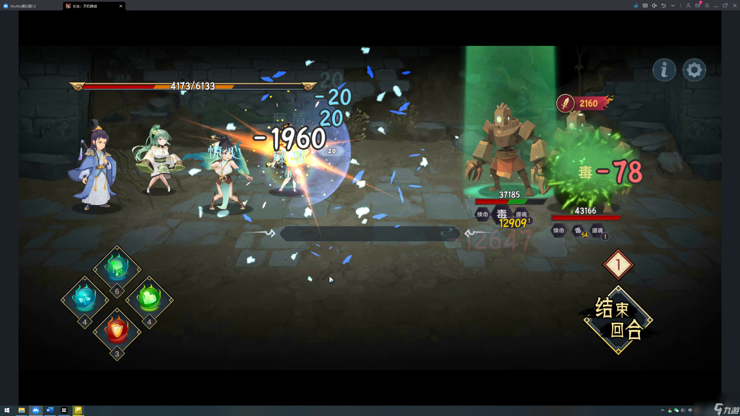 最后要注意的是,我们以叠毒为优先,因为没有五毒葫芦的增毒,所以我们每回合的毒是减少30%的,我们需要复制毒来保证毒量不减少,最后等到我们血量太低实在吃不下毒的时候就吃血丹维持血量不出牌,这样我们就不会因为中毒而掉血,靠后续的毒来慢慢磨死她。