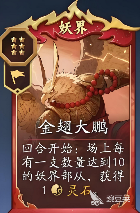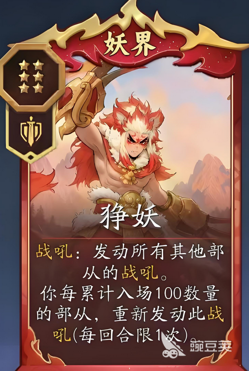 排在第四的是金翅大鹏,回合开始场上每有一只数量达到10的妖界部从,获得1灵石。这张牌是妖族所有阵容的核心卡牌,具有开局类冲锋能力,能快速造成高额伤害,虽然后续有些乏力,但只要开局好,后续就都不再是问题。排在第五的是狰妖,发动所有其他部从的战吼,每累计入场100数量的部从,就能重新发动此战吼。这是一张高本特殊效果的卡牌,并不局限于妖族,所有阵容都可以使用。