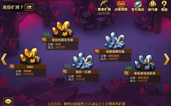 宝石矿洞:主要是为了拿宝石,前期算是快速提升战力的好东东了,但是位置不好抢呀,这时候,就需要加到巨巨们的公会,自己也能获得公会加成,并且其他公会的人不敢来欺负。