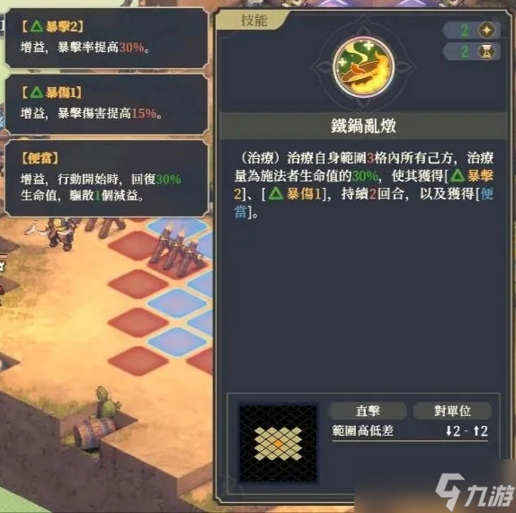 还有铁锅乱炖会对3格范围内所有己方回复30%生命值+队友各自行动开始时再回复30%生命并驱散一个减益+爆击2+爆伤1+技能能耗减1+冷却减1限一次
